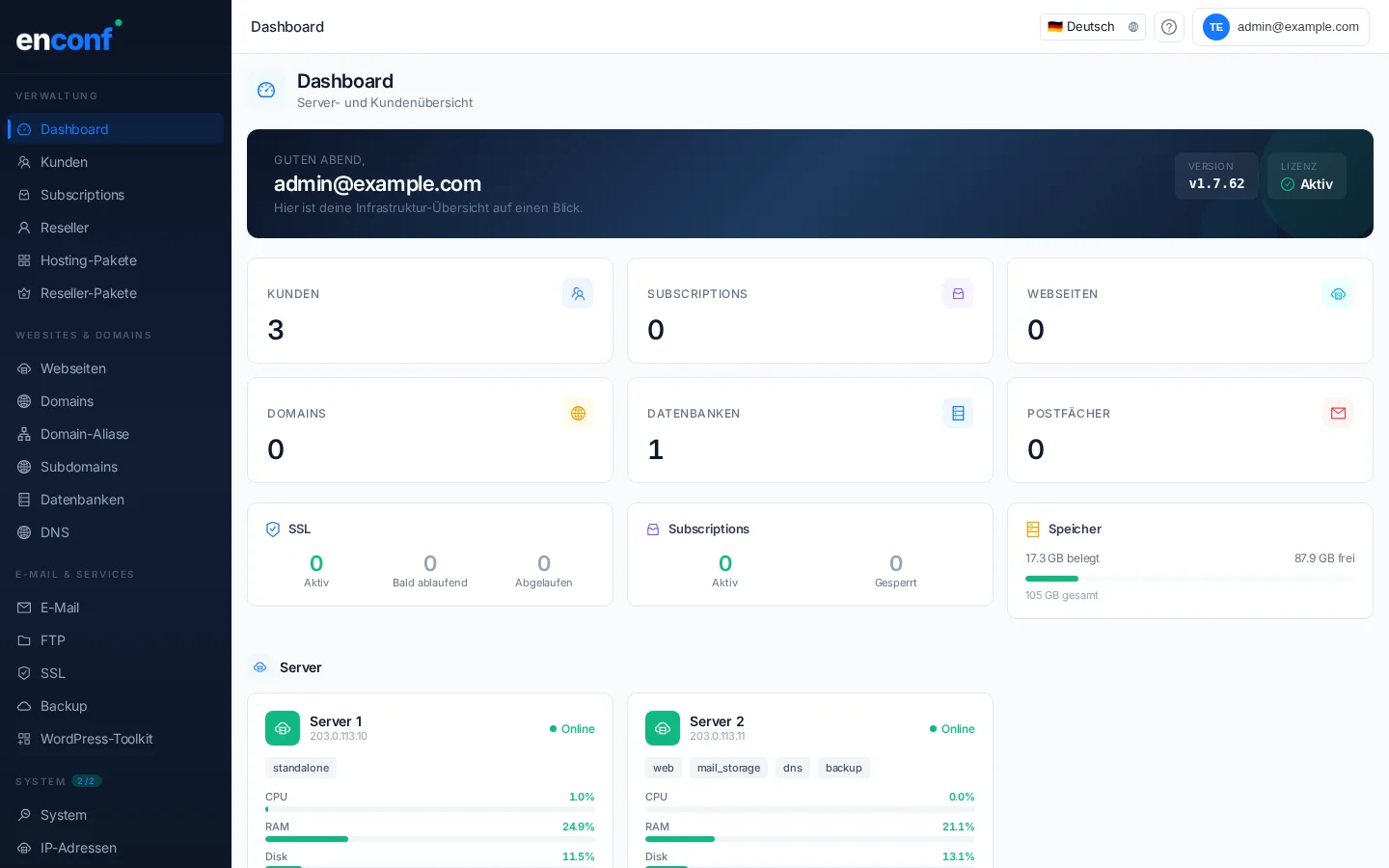 enconf ist ein leichtgewichtiges Webhosting Management Panel für Linux-Server. Es vereint Server-Verwaltung, Website-Management, E-Mail, DNS, SSL-Zertifikate, Backups und WordPress Toolkit in einer modernen Oberfläche. Es verbraucht unter 60 MB RAM und wird als native Go-Binary ausgeliefert — ohne Java, ohne Docker, ohne Bloat. Made in Germany, DSGVO-konform, kein US CLOUD Act.